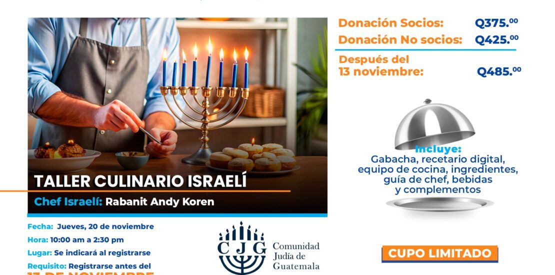 Participa en el Taller Culinario Israelí con el Chef Andy de Koren. Incluye ingredientes. Cupo limitado. Regístrate hoy mismo.