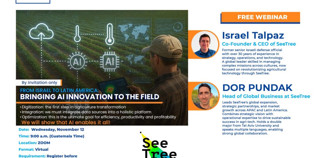 Join the free ISRACAM webinar: Bringing AI Innovation to the Field, with experts from SeeTree, Israel Talpaz and Dor Pundak, on Nov 12 at 9 AM.
