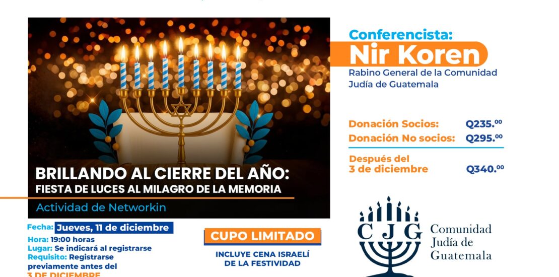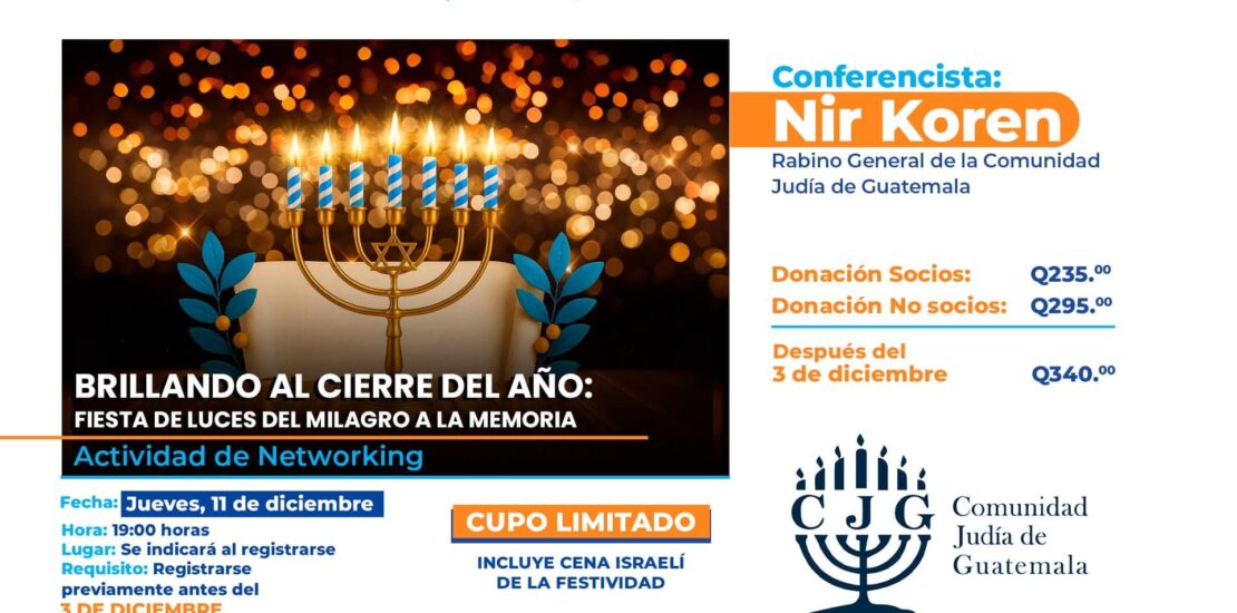 Únete a nuestra fiesta de luces del milagro ßAsiste al Encuentro Literario: Lecturas que Inspiran de ISRACAM con el Dr. Sergio Ralon. Regístrate antes del 21 de octubre. ¡Cupo limitado!al cierre del año con networking. Cena israelí y conferencia del Rabino Nir Koren.