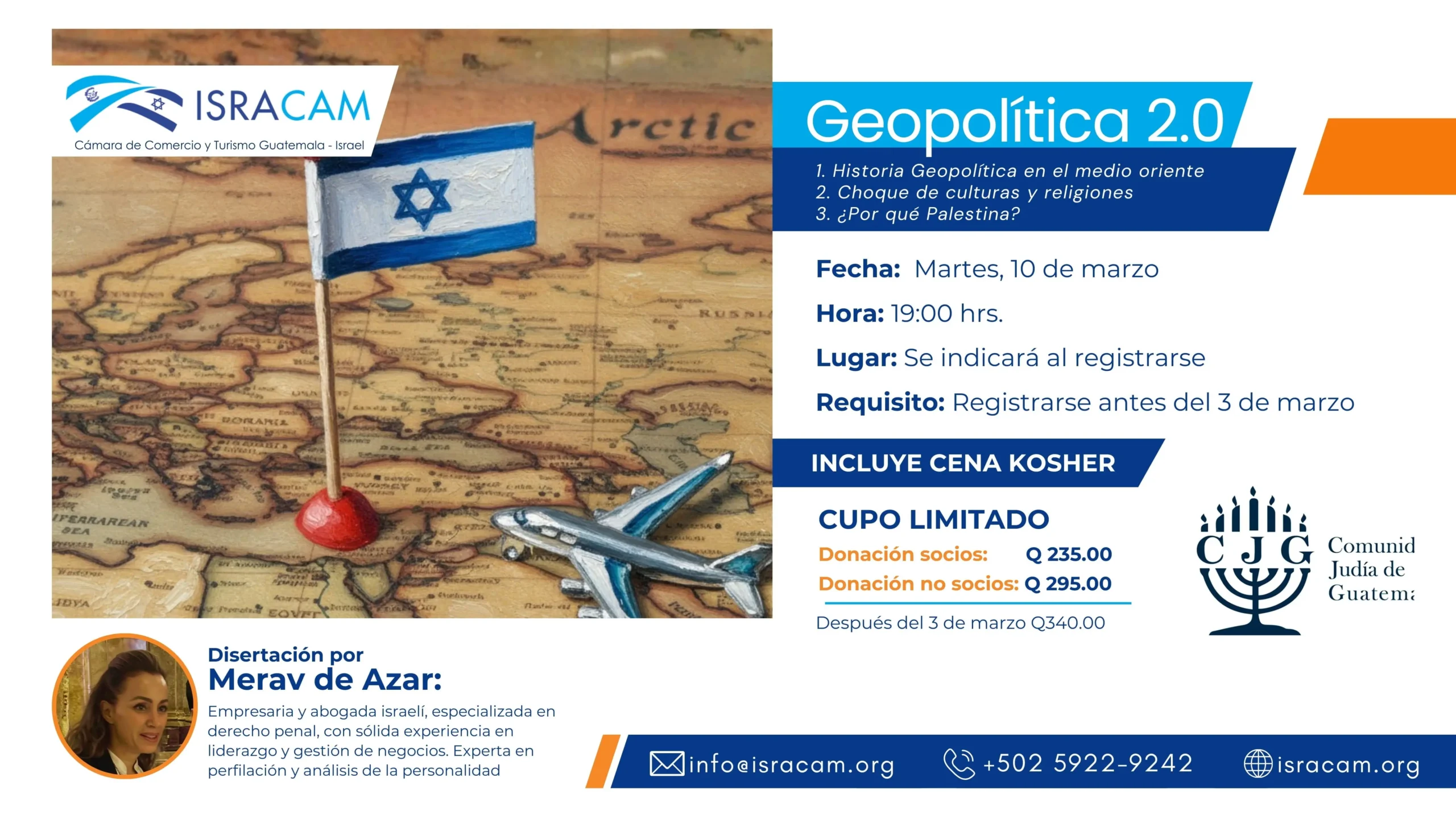 La Cámara de Comercio y Turismo Guatemala – Israel ISRACAM tiene el gusto de invitarle a la conferencia: Geopolítica 2.0 La conferencia será impartida por Merav de Azar, empresaria y abogada israelí, especializada en derecho penal, con sólida experiencia en liderazgo y gestión de negocios. Experta en perfilación y análisis de la personalidad. Este evento se llevará a cabo el día martes 10 de marzo a las 19:00 hrs.